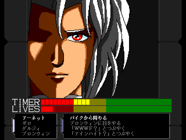 ゼロ 警戒する ブロンウィン 驚き、バイクから降りる |
