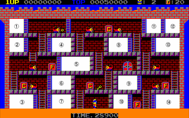 <WORLD1-①> ①【不要】鍵×1 ②【不要】鍵×1 ③鍵×1、F×1 ④【不要】鍵×1 ⑤【不要】鍵×1、蛸×1 ⑥【不要】鍵×1 ⑦【不要】鍵×1 ⑧【不要】鍵×1 ⑨【不要】鍵×1 ⑩【不要】鍵×1 ⑪出口鍵 ⑫S×1 ⑬【不要】鍵×1、蠍×1 ⑭鍵×2 ※まとめて敵を倒すなど武器の節約を意識すること。 ※コンティニュー:GAME OVER表示中にH→E→L→P押下 (1回のみ:クリスになる) |