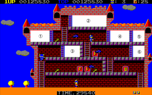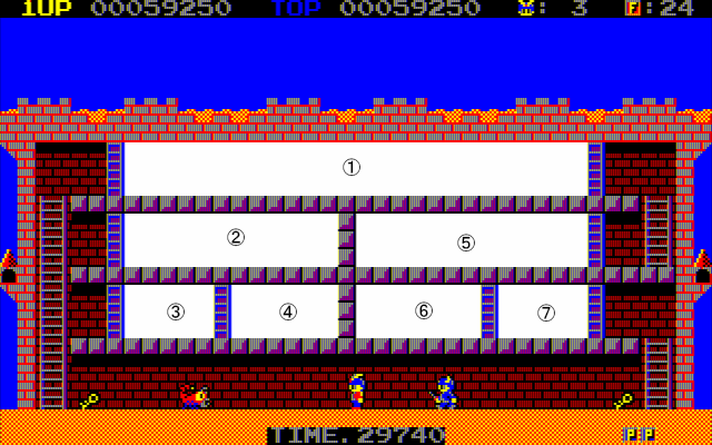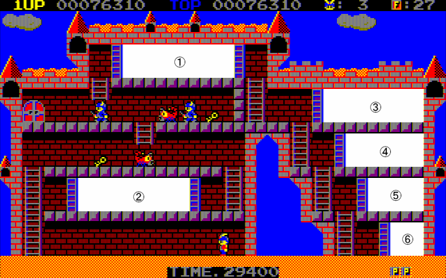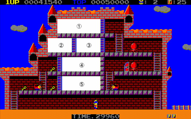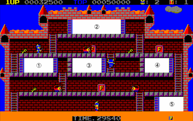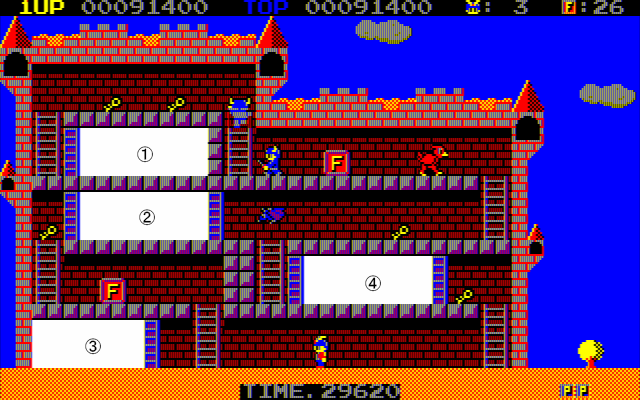 <WORLD1-③> ①鍵×1、P×1 ②鍵×2、蠍×1、F×1 ③鍵×1、出口鍵 ④出口、F×1 ⑤鍵×1、F×1 |