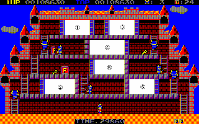 <WORLD1-⑧> ①鍵×2 ②鍵×1、C×1 ③鍵×2 ④出口、F×1 ⑤鍵×1、T×1 ⑥出口鍵、F×1 |